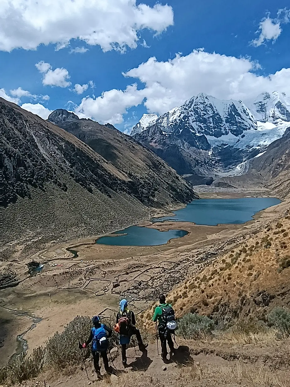 Iniciaremos la caminata por las orillas de la laguna Carhuacocha, bordeando diversos espejos de agua hasta alcanzar el Mirador de las Tres Lagunas. Desde este punto, disfrutaremos de una vista privilegiada de los tres depósitos de agua y sus tonalidades únicas, situados al pie de las majestuosas montañas Siula Grande y Yerupajá. Finalmente, retornaremos por el mismo sendero hacia nuestro campamento.»