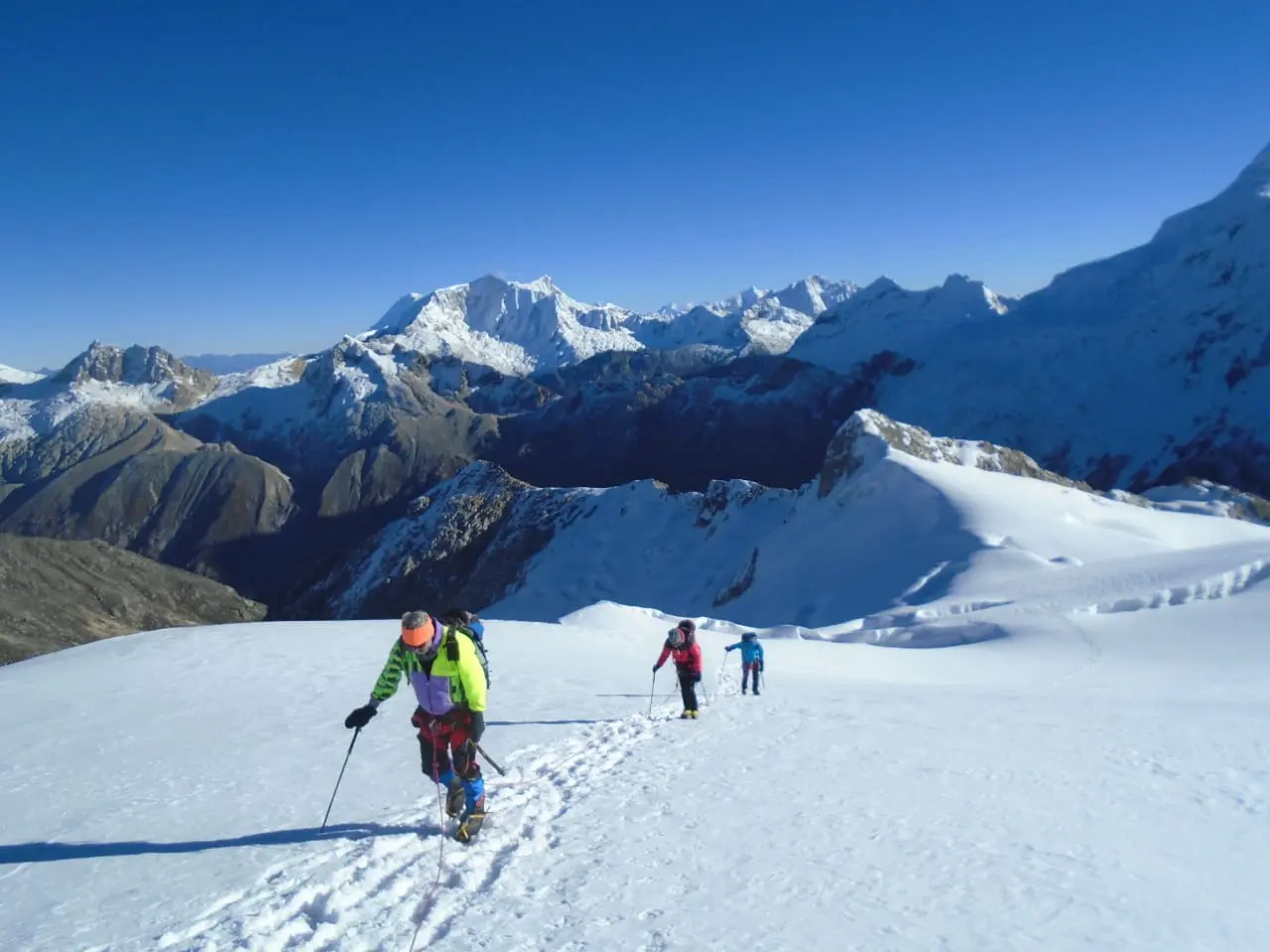 La actividad comienza a la 1:00 a.m. Iniciamos el ascenso a través de un extenso glaciar hasta alcanzar la arista noroeste. Siguiendo esta arista, coronamos la cumbre para disfrutar de una impresionante vista panorámica de la cordillera. Finalmente, emprendemos el descenso por la misma ruta, pasando por el campo morrena hasta retornar al campo base.